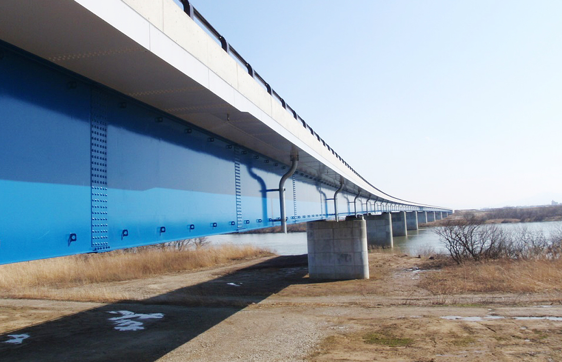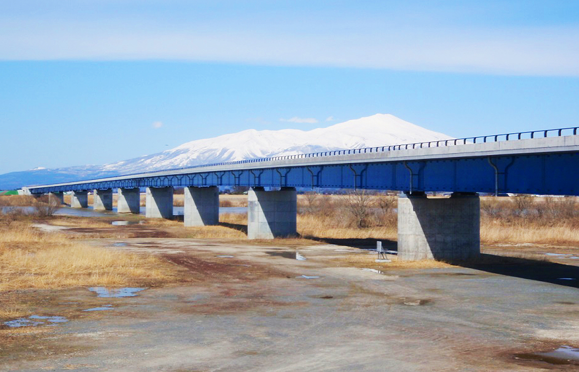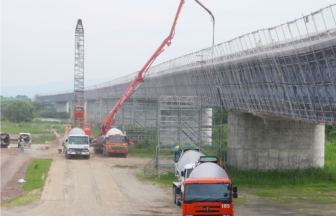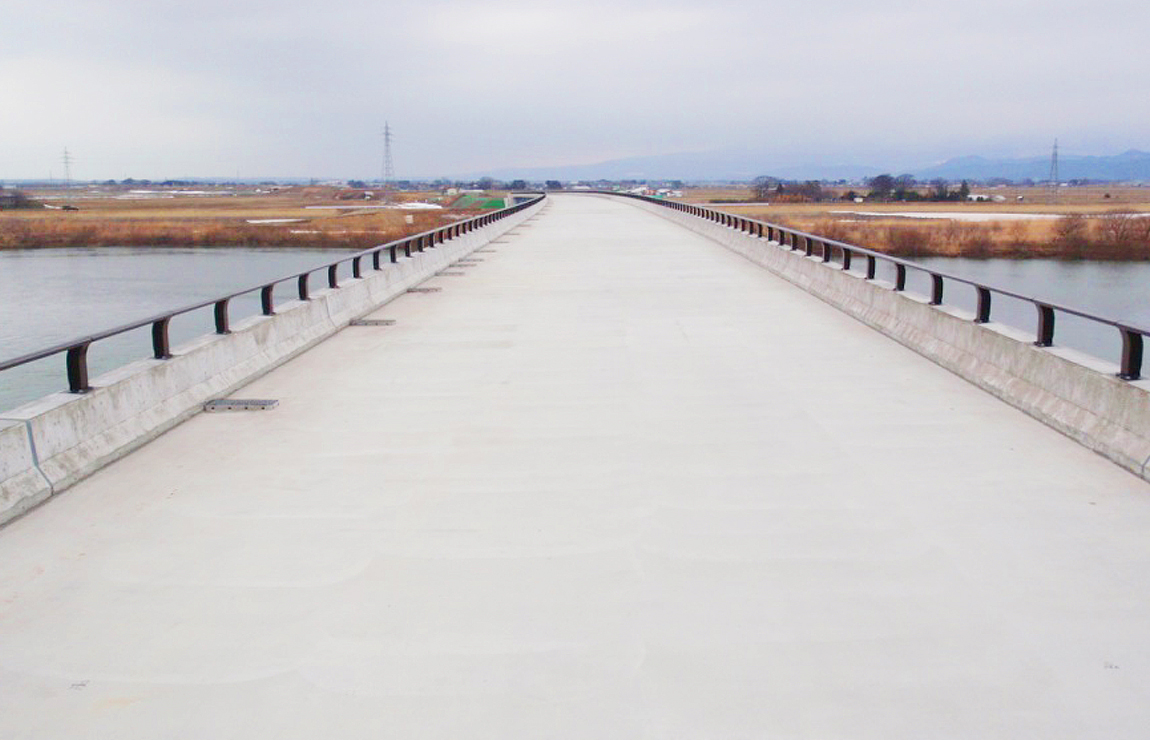 余目酒田道路事業の一環として酒田市新堀~砂越間の最上川に架かる庄内中央大橋の床版工工事です。橋長 685m となる長大橋の合成床版逐次合成は全国にも前例がない工事でした。