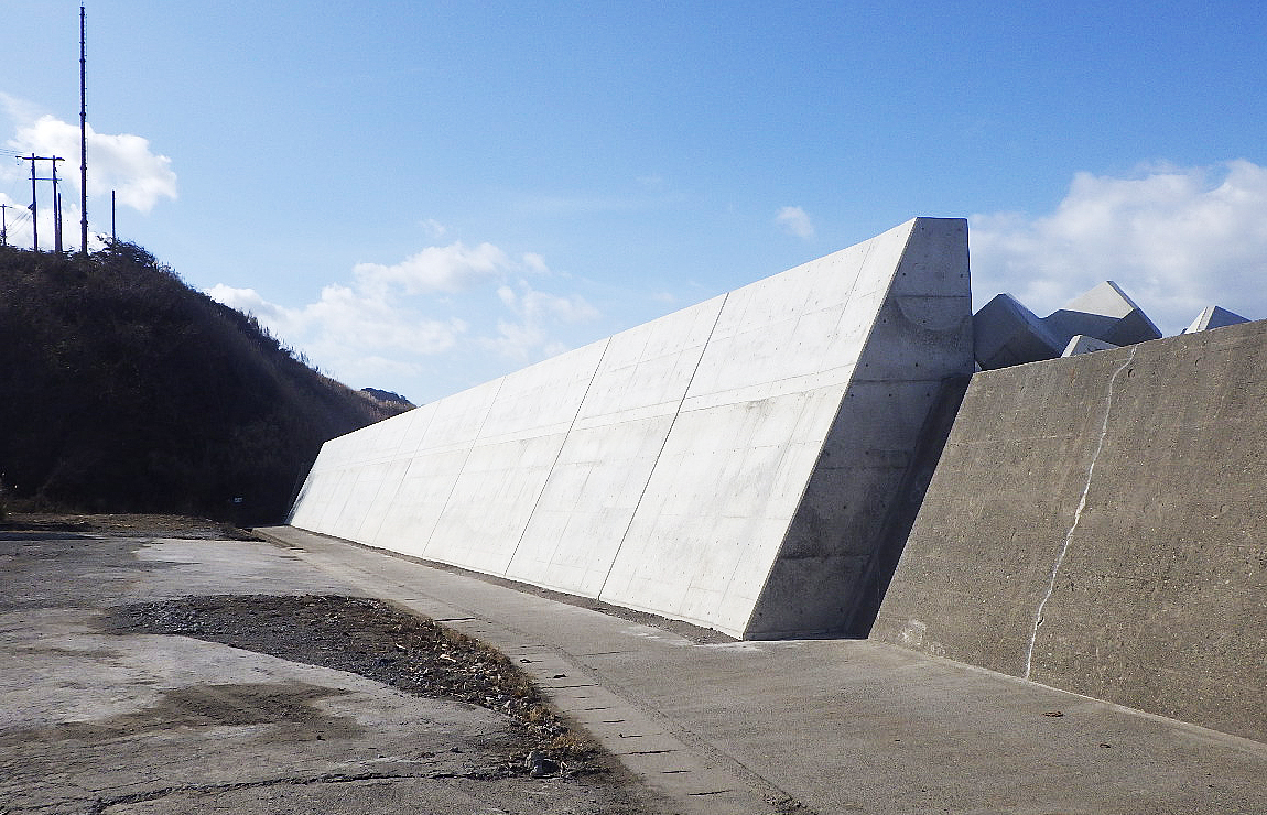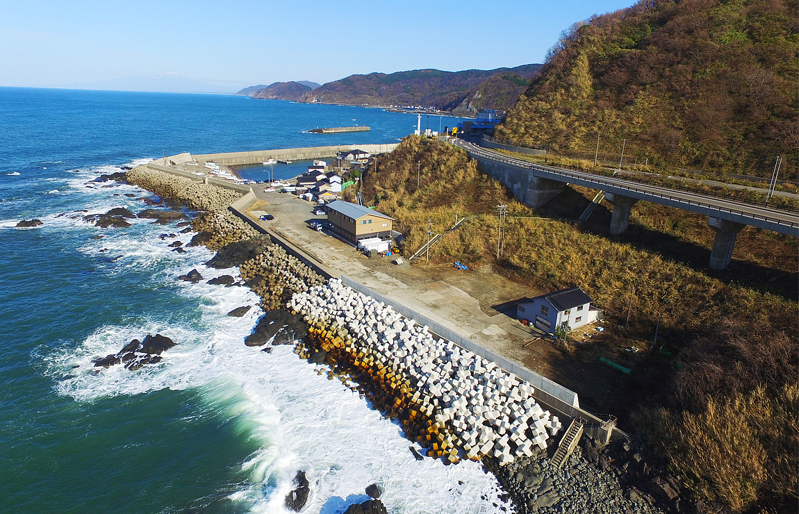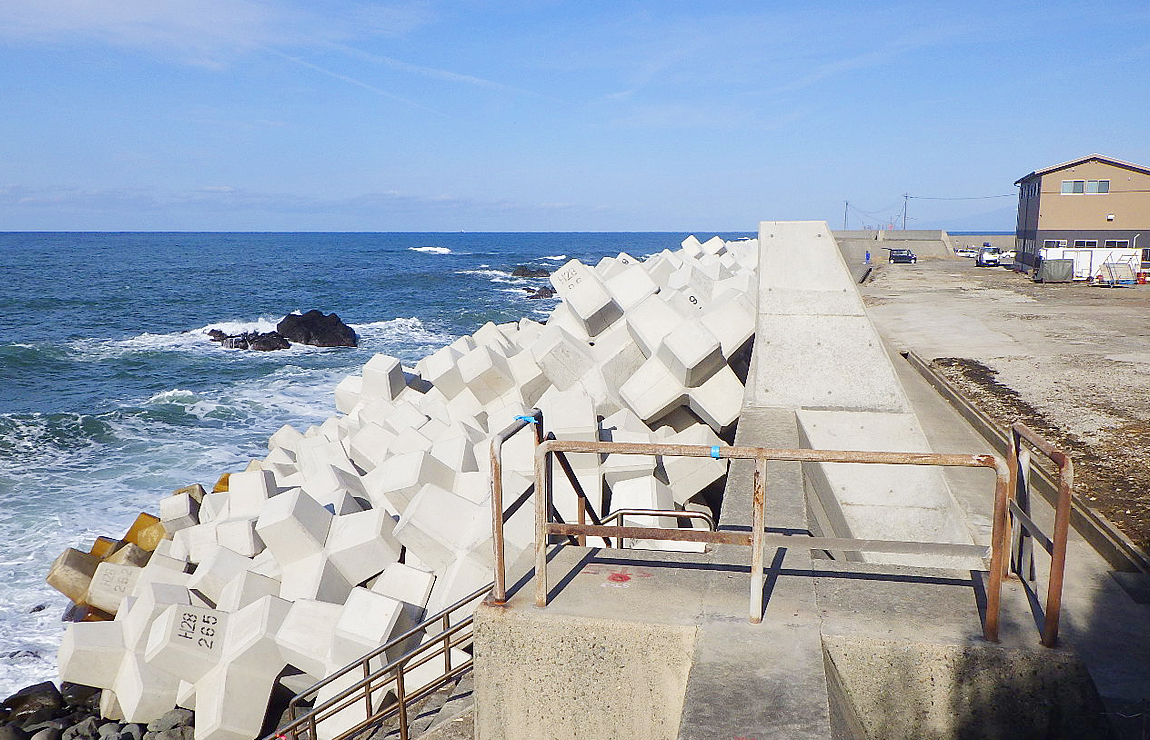 堅苔沢漁港の海岸護岸の嵩上げと、消波ブロックの据え直し及び新規据え付けを行いました。
