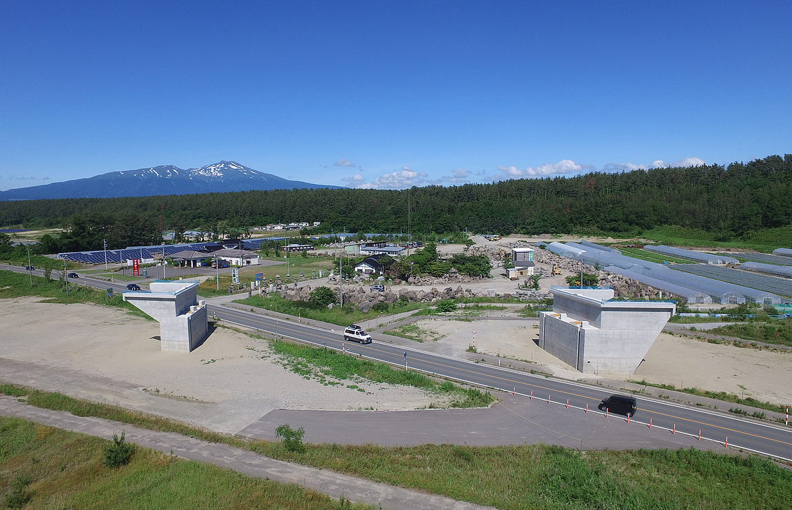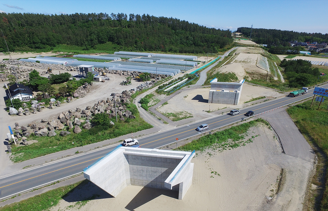 日本海沿岸東北自動車道(酒田みなと~遊佐間)の改築事業の一環として遊佐町比子地内で国道7号のこ道橋の橋台2基を構築した工事です。施工途中での基礎工法の見直しなどもあり施工管理に苦慮する場面もありましたが、コンクリート表面の出来映えも良く完成することができました。