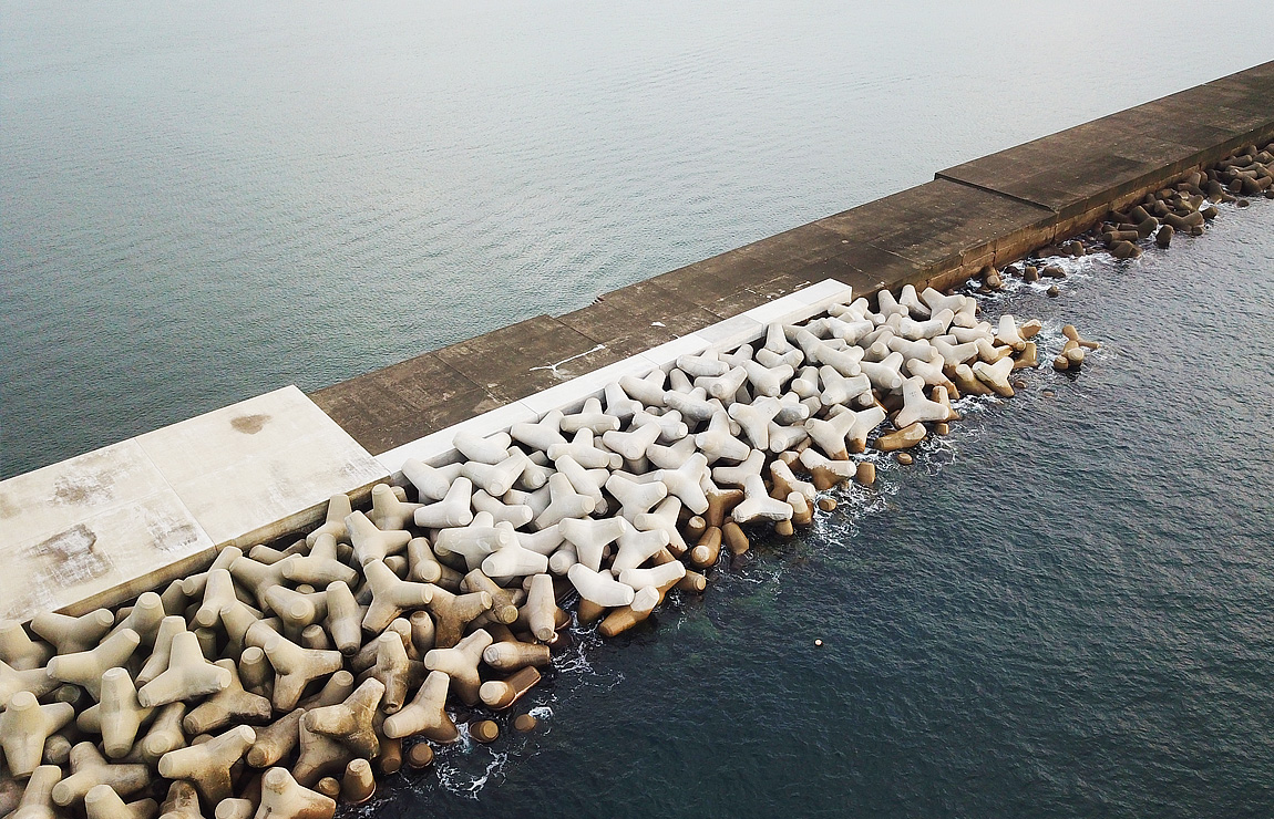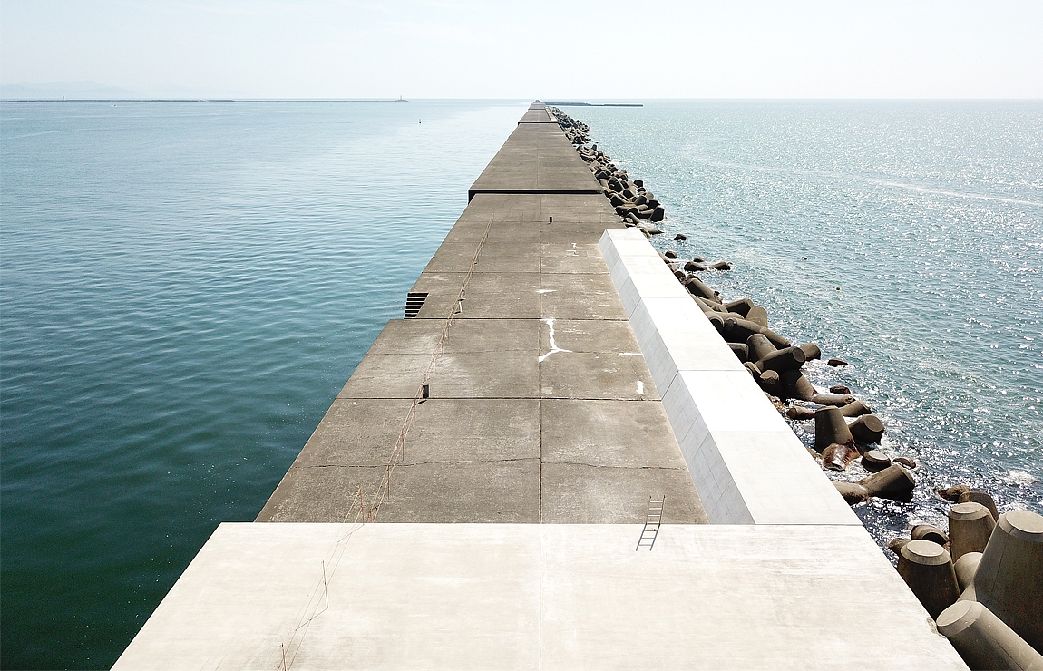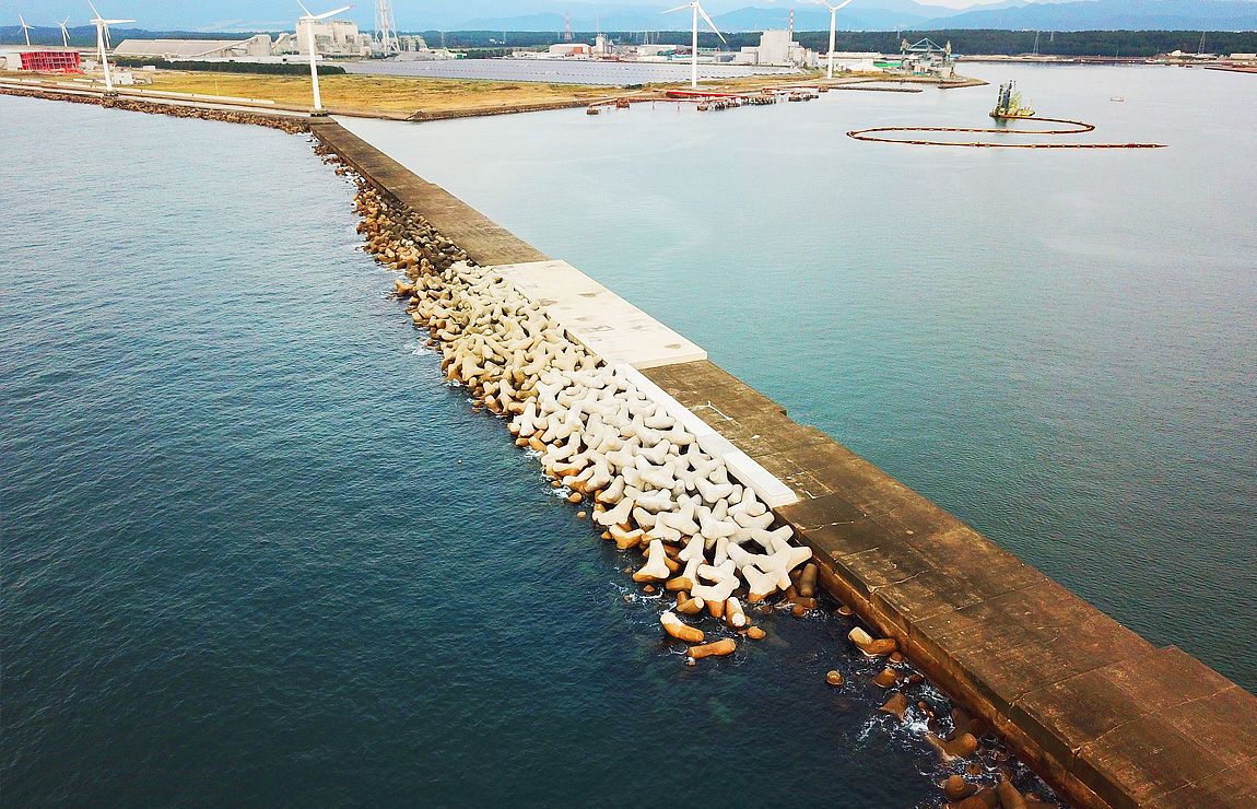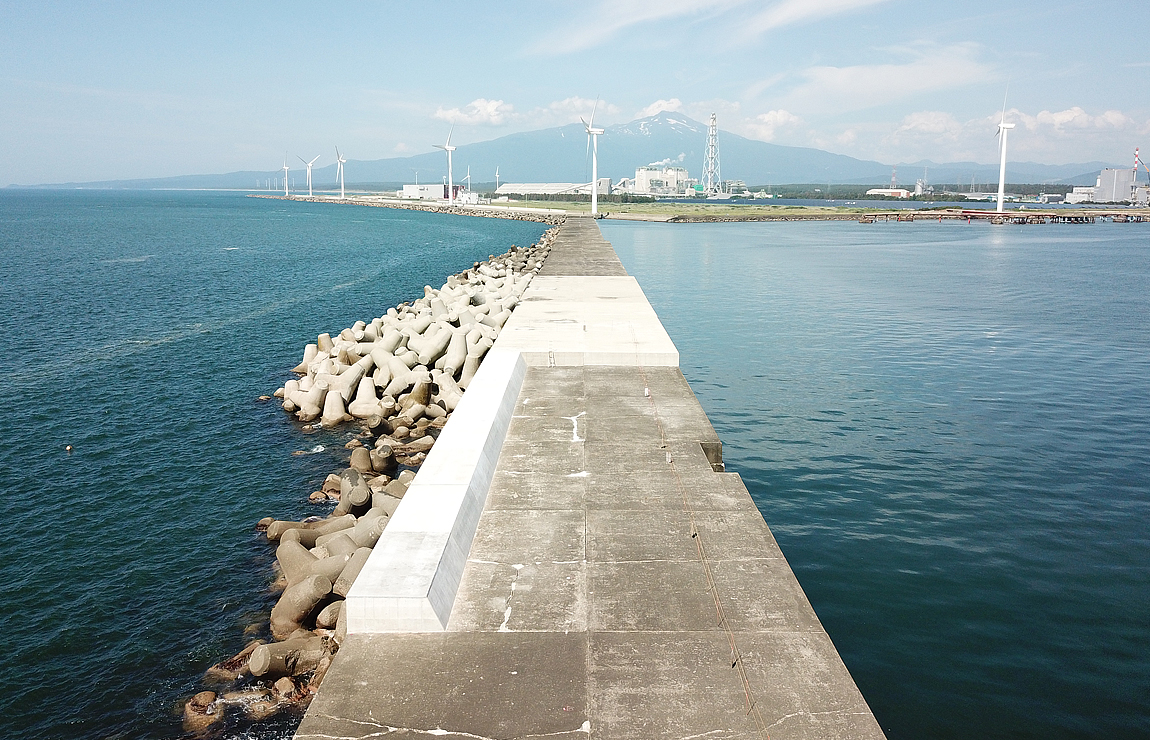 防波堤(酒田北港離岸堤)の機能を向上させる工事です。設置から長期間を経て波の影響で消波ブロックの沈下が発生します。この工事では、防波堤上部の嵩上げと消波ブロックの新規据え付けを行いました。