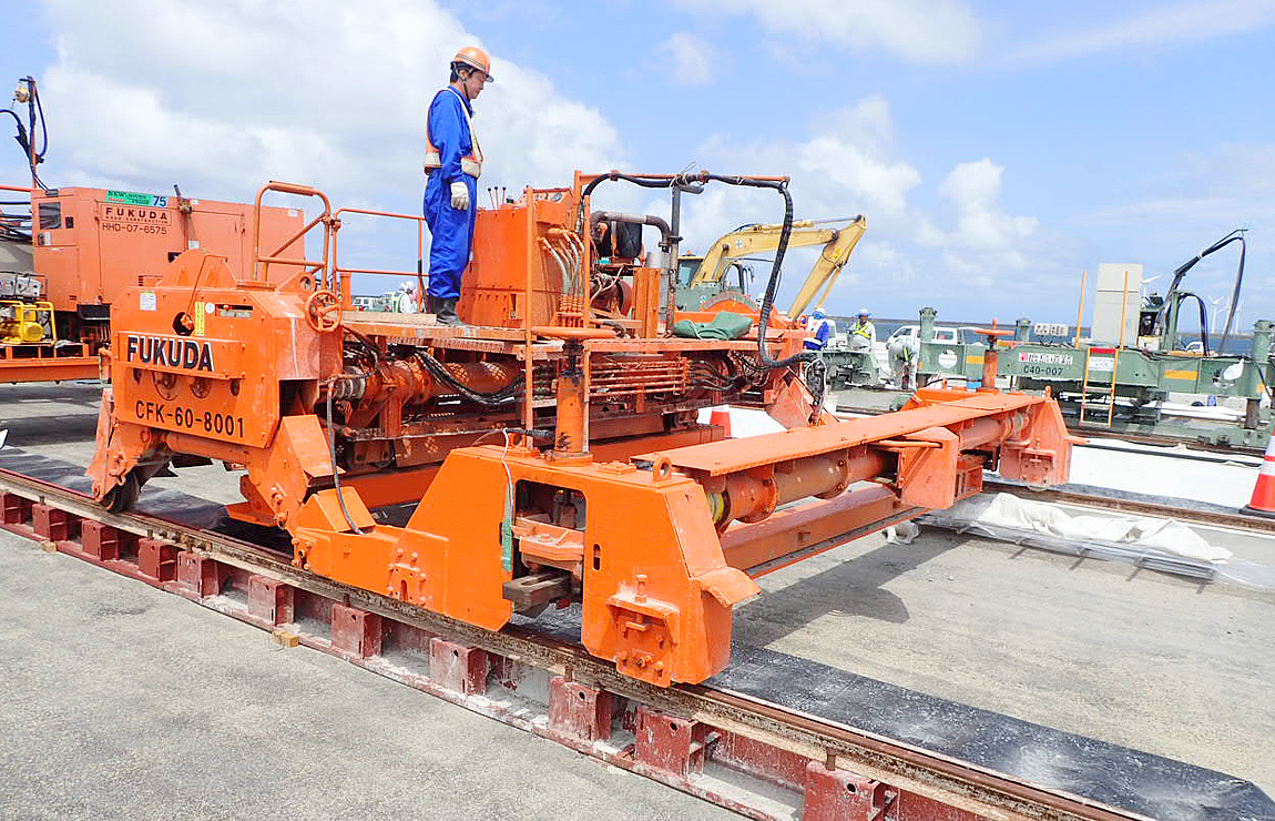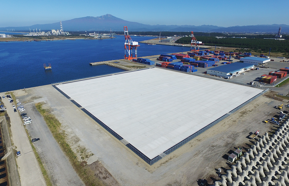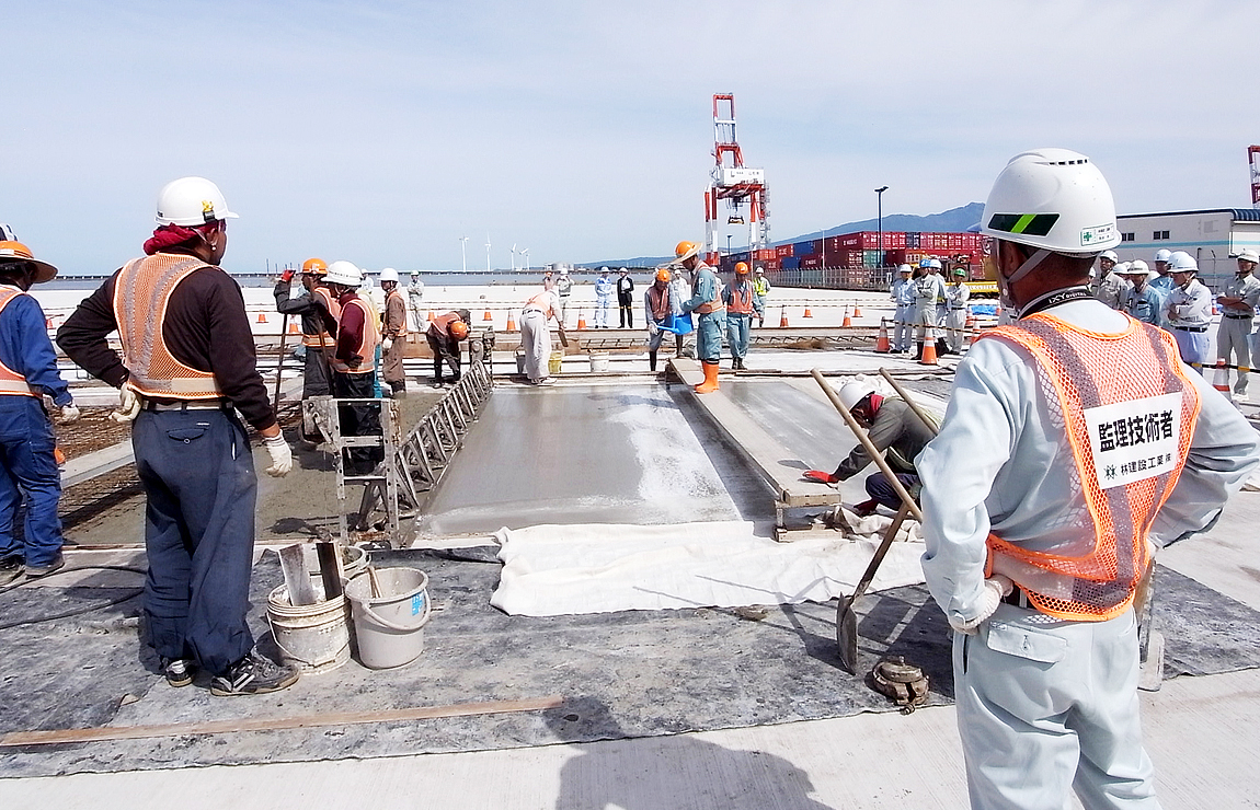 酒田港の取扱貨物量の増大に対応できるよう、コンテナターミナルを拡張するコンクリート舗装工事です。