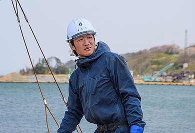 高校生のときに林建設工業の会社見学に参加しました。普段何気なく使っている道路や橋、なかなか表には見えづらい部分を皆さんが一生懸命造っているのを見て、自分もそんな仕事をしたいなと。建設業は専門的な仕事なので、道具の名前や用語など、先輩に一から聞いて覚えました。「ピン柵(先がくるっと丸くなっているピン)」を「豚ピン」と呼ぶ方もいて、最初は分かりませんでしたが今は慣れました(笑)。今は、岸壁のコンクリート補修のため、防舷材の取り外し作業をしています。カゴを吊るして、自分がそれに乗って下に降り、ボルトを外しながら次に移って、順序よく…。